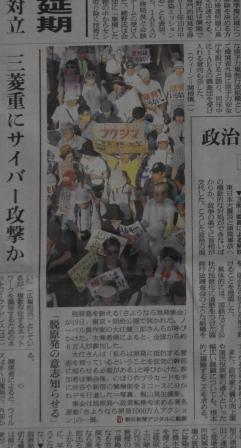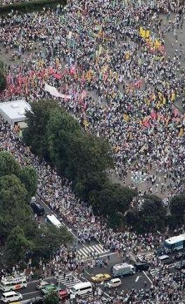 これだけだと一面カラーといっても小さな記事だし、「ふ~ん、そんな集会があったのか」という程度で読み流す人も多そうだが、下に貼った空から撮影したものをみるとイメージが数段異なるなんともすごい規模。ウソでは決してないんだけど、受け取るイメージは相当に違う。