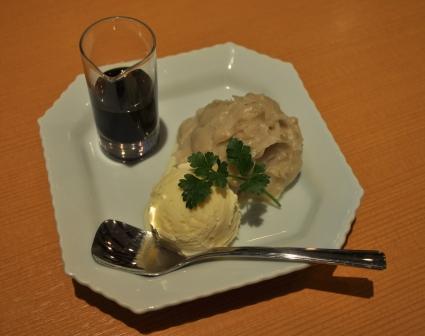 右上はデザートメニューのひとつ「塩そばがきの黒蜜がけ~アイスクリームを添えて~」で、別添えの黒蜜をかけて食べます。icoroのSさんが「とってももちもちー。バニラアイスとあいまってうまー。」と以前ブログで書いてましたが、まさにその通りといった感じで美味しかったです。(初めて食べました)