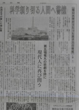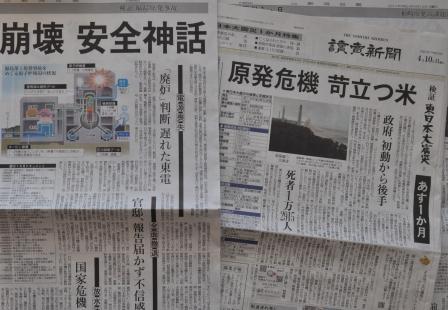 読売新聞には、原発事故が国際的な問題にも発展し米国の苛立ちを増幅させたことに対し「なぜ初動から後手に回ったのか。菅政権、経済産業省原子力保全・保安院、東電の対応を検証した」とある。読み応えもあってよかったのだが、でもちょっとまてよと思ってしまったのは、自身、つまりはメディアの報道対応の検証は含まないのか、ということ。この1か月、(素人目にも都合の悪い情報は隠蔽していると見える)東電や(素人目にもまやかしでしかない発言だと思える)原子力のいわゆる専門家たちへの扱いを見ると、そちらもやらなきゃおかしいだろと突っ込みを入れたくなる。なんたって、プルトニウムは食べても安全、塩を食べるのと大差ないんですよ、などとメディアで言う大学教授がいるくらいだから。