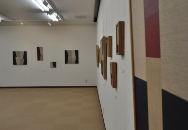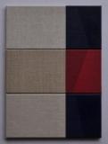 作品は簡素で、アクリル絵具で部分的に着彩された明解な色面の構成がフラットな空間を創りながら、キャンバス地特有の肌合いと微かな色調の差が調和を引き出す。また、分割された枠面のつくる接合部の、境界を形成するラインも見逃せない。区分するように塗られた色面に生じるラインとは別に、細い谷間に影を落としての分割線となる。