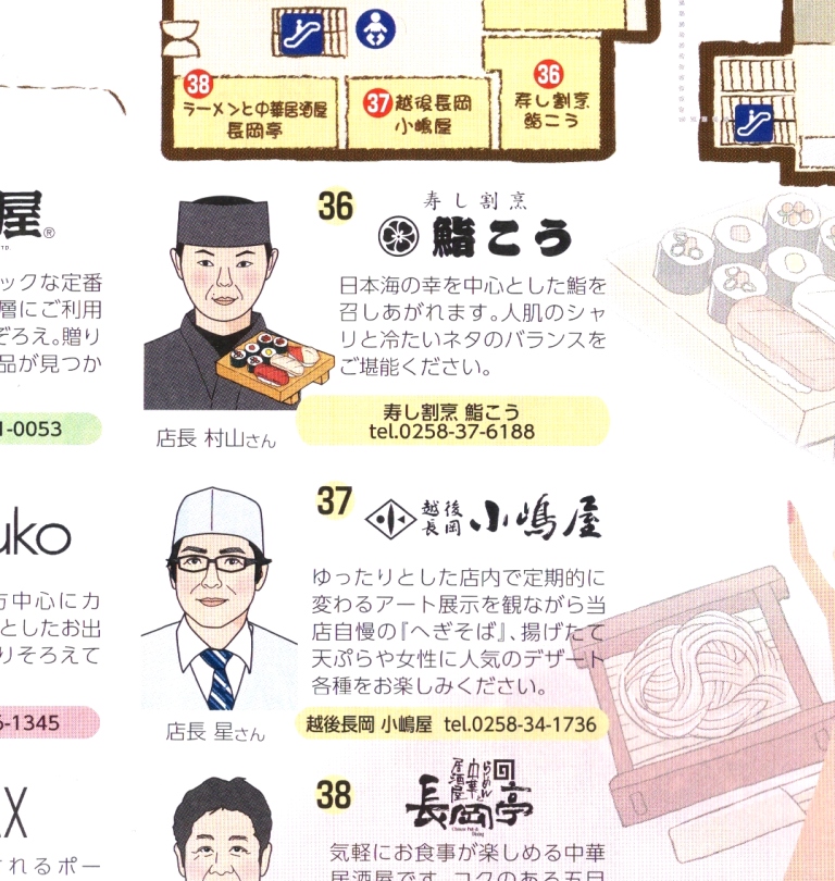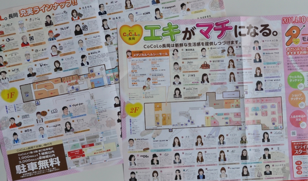左の画像はクリックすると大きくなるが、先週の木曜あたりだったか新聞折り込みではいってきた駅ビル「CoCoLo長岡」のチラシ。テナントの各店の店長さん(あるいはスタッフ)の似顔絵が掲載され、それぞれの店を紹介している。
