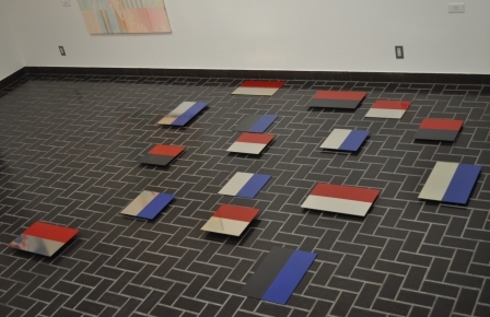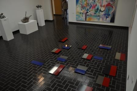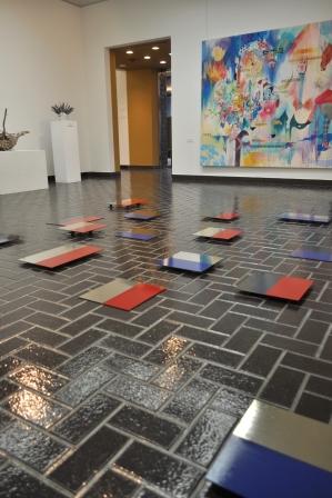 素材は規格サイズの鉄板。一部だけ着彩し、床面に並べたインスタレーションである。