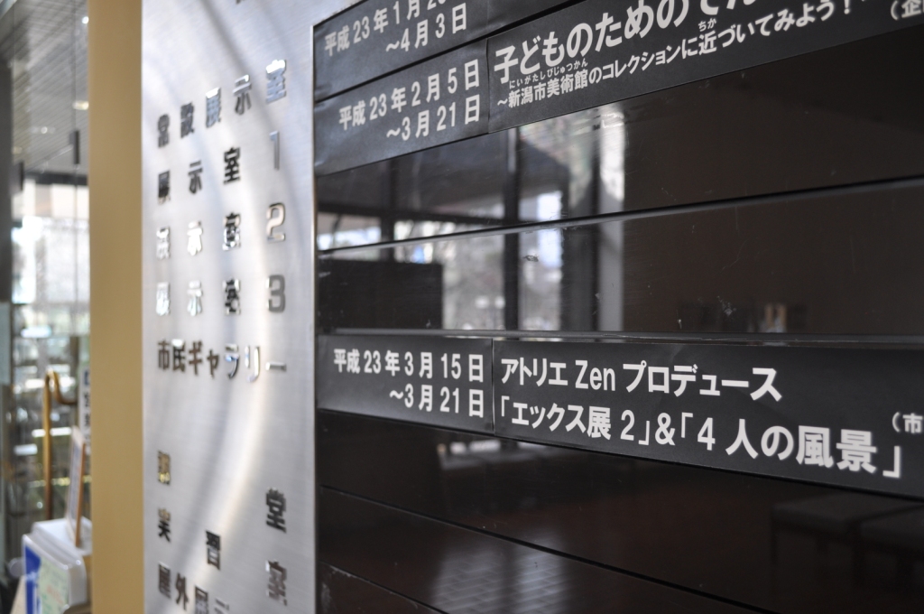 新潟市美術館ギャラリーで本日より「4人の風景&エックス展Ⅱ」がスタートしましたが、ニュースでご承知の通り新潟県内でも計画停電の実施となりましたので、その対応についてとりいそぎ以下お知らせいたします。
