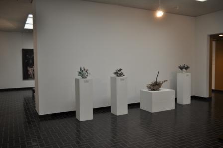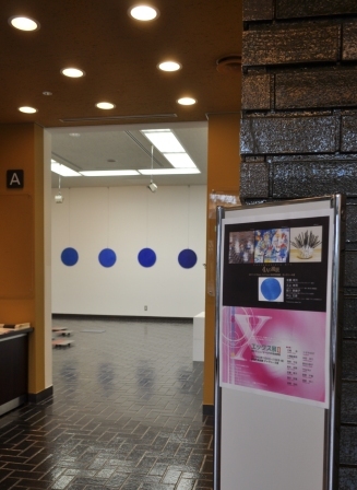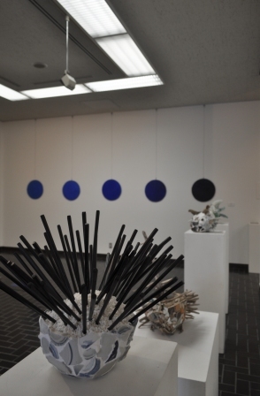 左はB室で開催中の「エックス展Ⅱ~若きクリエイターたちの自由表現」の一風景。中央手前に置いてあるのは椅子ではなく、椅子のようにして展示したトヨヲカ37さんの作品。実際に座ってもよい。