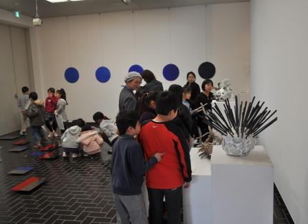 午前中は知人作家やら出展者の友人やらが入れ替わりで訪れ、さらに、美術館企画展示室の「子どものためのてんらんかい」には幼稚園児が何団体か来て、ギャラリーの前を楽しそうに通るなど、割と動きがあって面白かった。