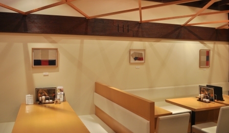 ■ 蕎麦店内での展示となります。名物の蕎麦だけでなく、コーヒーや紅茶(いずれも315円)、「焦がし蕎麦粉のあんみつ」「そばがき」などの甘味メニューもあります。喫茶での利用もOKです。