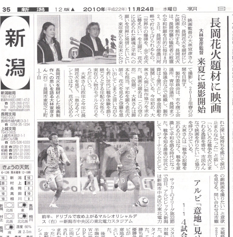 新潟版では“大林宣彦監督が長岡花火をモチーフにした映画を制作する”という記事が出ていた。写真は先般の記者会見のときのものだろう。監督と実行委員長とのツーショットである。