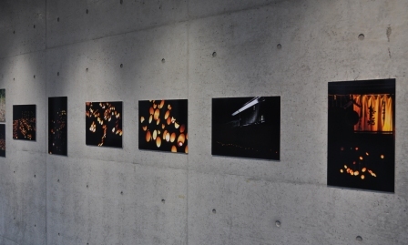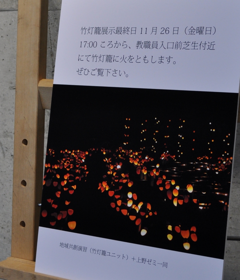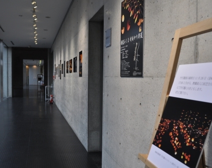 さて上の写真は、今日行った際に見た大学廊下での展示。コンクリート打ちっ放しの壁面を使って「竹灯篭」の写真が展示されていた。 “(展示最終日の)今日、17時から教職員入口前芝生付近にて竹灯篭に火をともす”とも書いてあるのだが、残念ながら時すでに遅しであった。