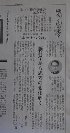 “インターネットがわたしたちの脳にしていること”とサブタイトルがつく。要は「ネットが思考そのものを変えるということを脳科学の知見から解き明かしている」のだそうだ。記事には、車の運転でカーナビ頼りの場合と、地図を頭にたたきこみ、2次元の情報を3次元の風景に変換(知的作業の駆使)する場合とどちらが脳を使うか?と例えがある。私自身はカーナビを一切使わず、むしろカーナビというのは記憶力など自身の脳力を退化させるのではないかと思っていたから、妙に納得である。だが、記事は続けて「つまりネット依存はすべてカーナビ頼りの生活のようなもの」とあるからドキリである。本の衝動買いというのは最近はあまりしないようにしているが、読んでみたいのでさっそくアマゾンで注文した。