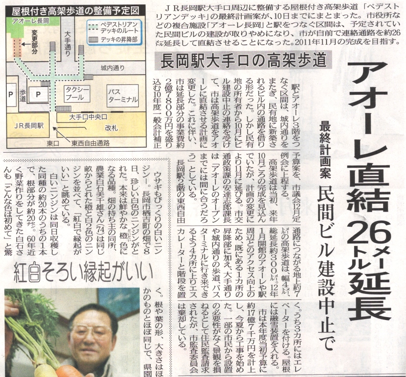 長岡駅の写真である。上越新幹線の開業を機に建て替えられたもので、昭和55年に供用開始されているから今年で30年となる。30周年ともなると例えばスーパーだと盛大に「30周年記念セール」を打つところであるが、駅だとそういう発想にはならないようで、また、市民にとっても日頃見なれた風景となっているためか、ことさらの意識はないようだ。