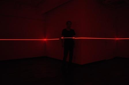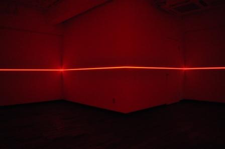 真っ暗にしたギャラリー空間に赤いライン(光)をひく。撮影は長時間露出となるが、右のほうには作家自身も(その間、身動きしないようにして)はいってもらった。
