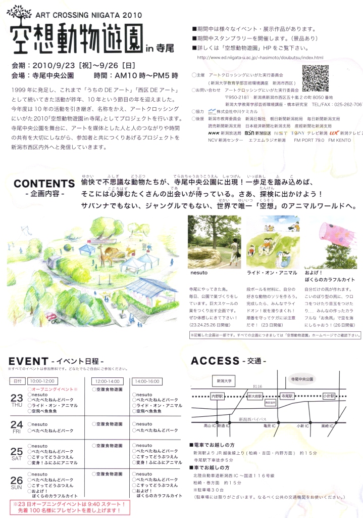 こうした天気だとやはり野外展が似合うよな、と、思い出したのが、新潟大生らによって開催中の「空想動物遊園」なる催し。テレビニュースで詳しくやっていたのでそれは見たが、この期間、私自身はONE Mart EXPRESSの会場に詰めることも多くて、行けず終いとなりそうだ。