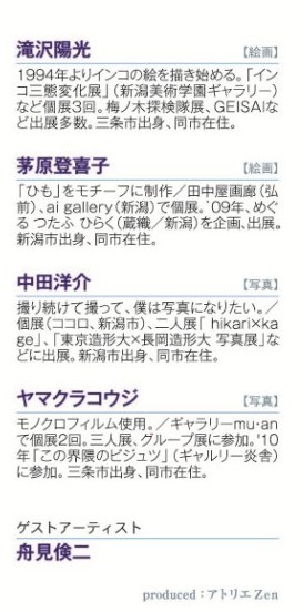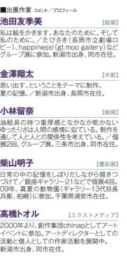 アート作家。同アトリエをベースにアートイベントの企画・コーディネートにたずさわっているほか、長岡で発行している地域情報誌「マイスキップ」の編集にも関わっています。