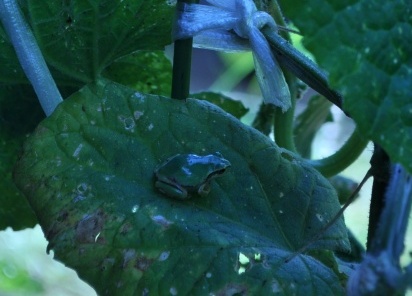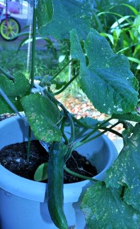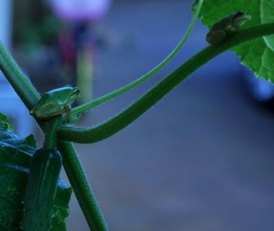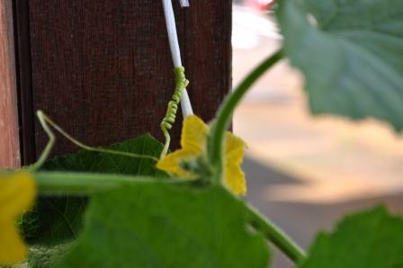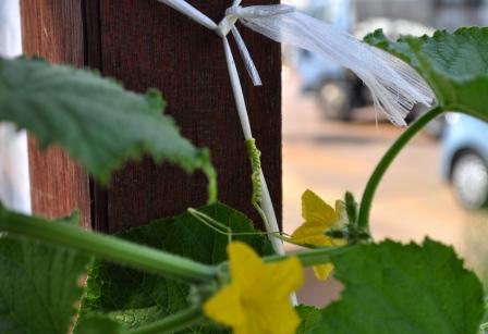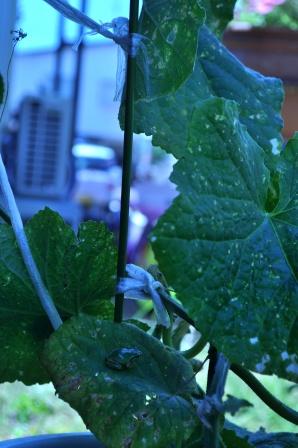 図書館で借りてきた「きゅうり百科」を読んだら、そろそろ摘心して、上へ伸びるエネルギーを実のほうに廻すのがセオリーらしいのだが、あちこちにつかまりながら上へ上へと伸びていく様子が面白く、まだ摘心していない。