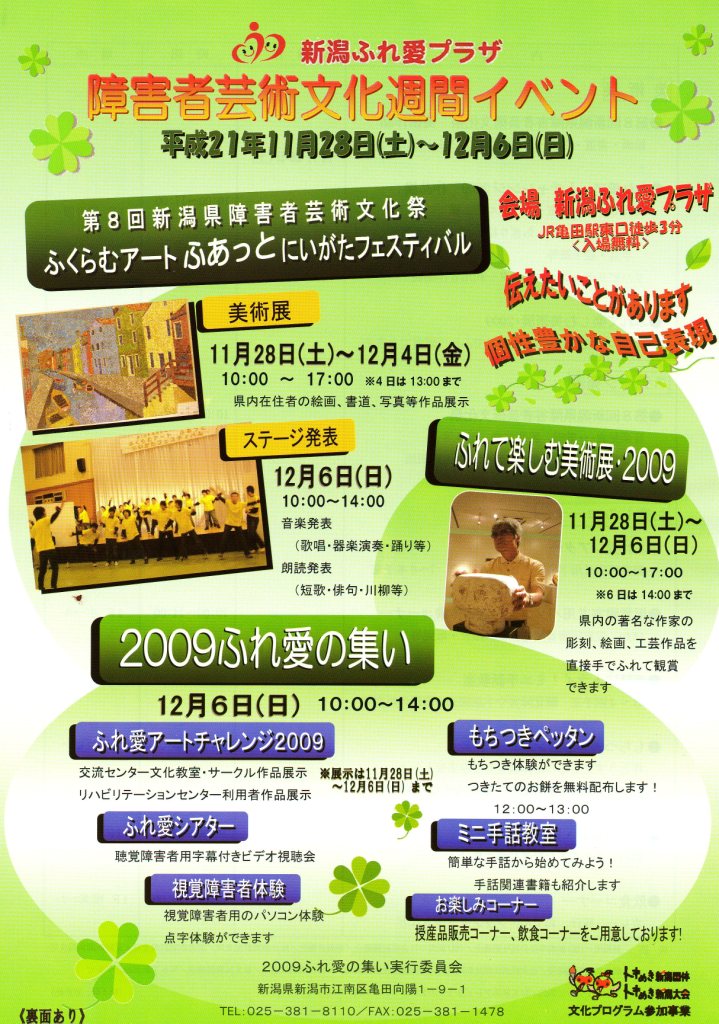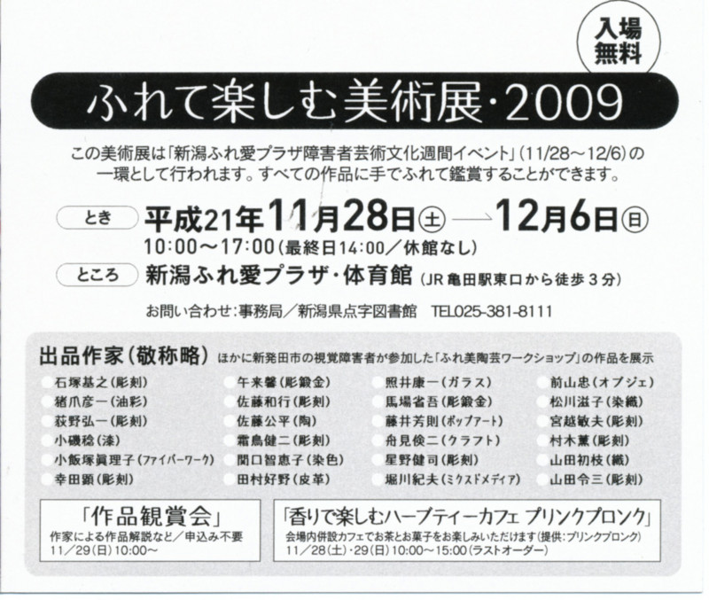 今朝の新潟日報・アートピックス欄でも紹介されていますが、視覚障がいのある人も楽しめるアートということで、“すべての作品に手で触れて観賞する”ことができる作品展。「新潟ふれ愛プラザ障害者芸術文化週間イベント」の一貫として開催。