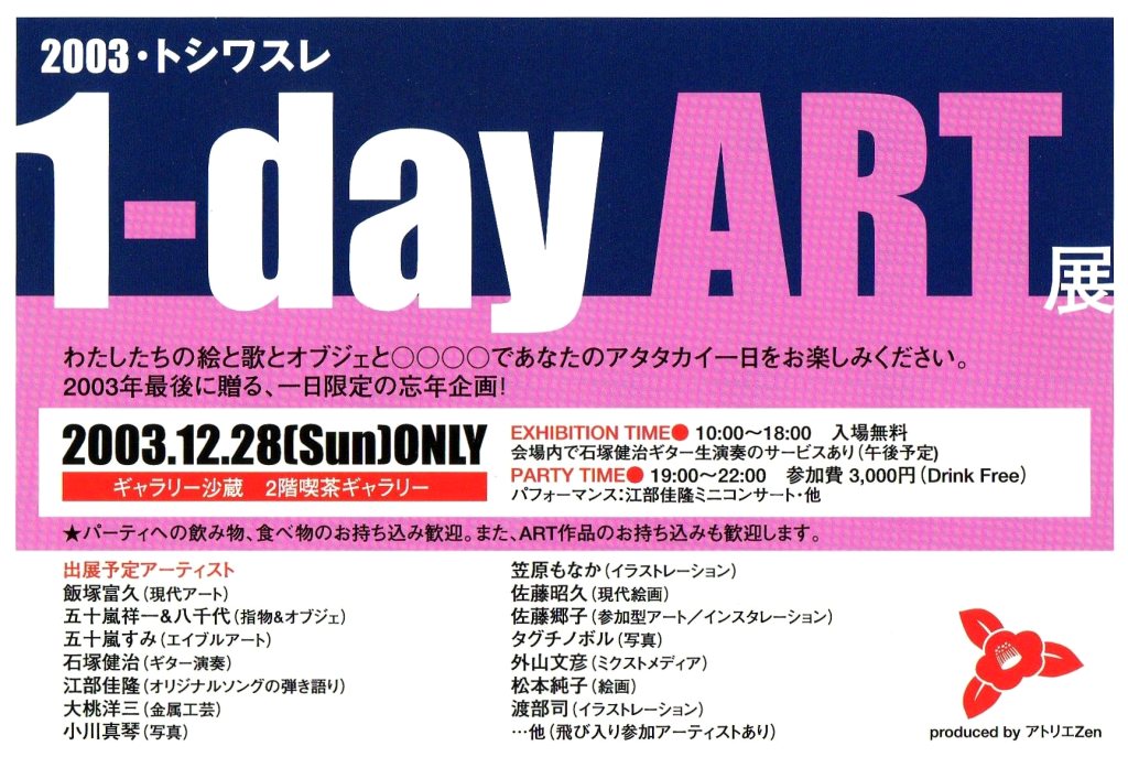 右は2003年の年末にギャラリー沙蔵を借り切っておこなった一日展「1-day ART展」のフライヤー。この2003年まで、年末には忘年会を兼ねての展覧会を毎年企画していたが、近年はおこなっていない。たまに要望されることもあるのだが。