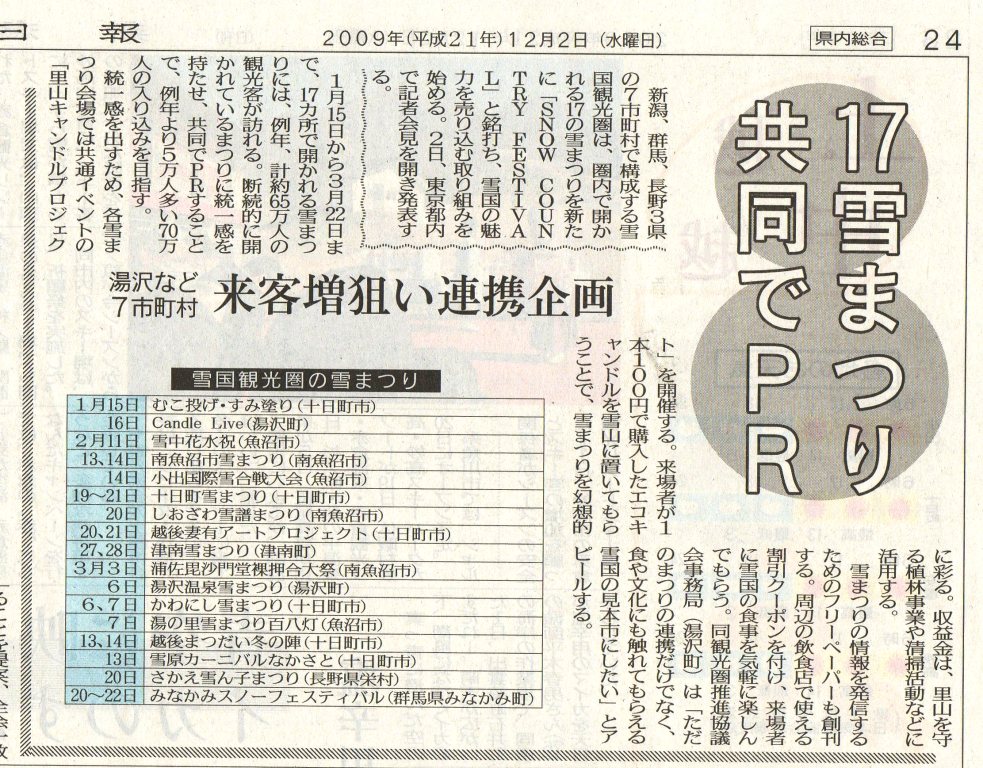 『新潟、群馬、長野3県の7市町村で構成する雪国観光圏は、圏内で開かれる17の雪まつりを新たに「SNOW COUNTRY FESTIVAL」と銘打ち、雪国の魅力を売り込む取り組みを始める』とのこと。