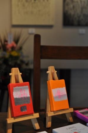 右は水野竜生展。写真におさめたのは、記帳台に置かれていたマッチ箱サイズのキャンバス絵画。