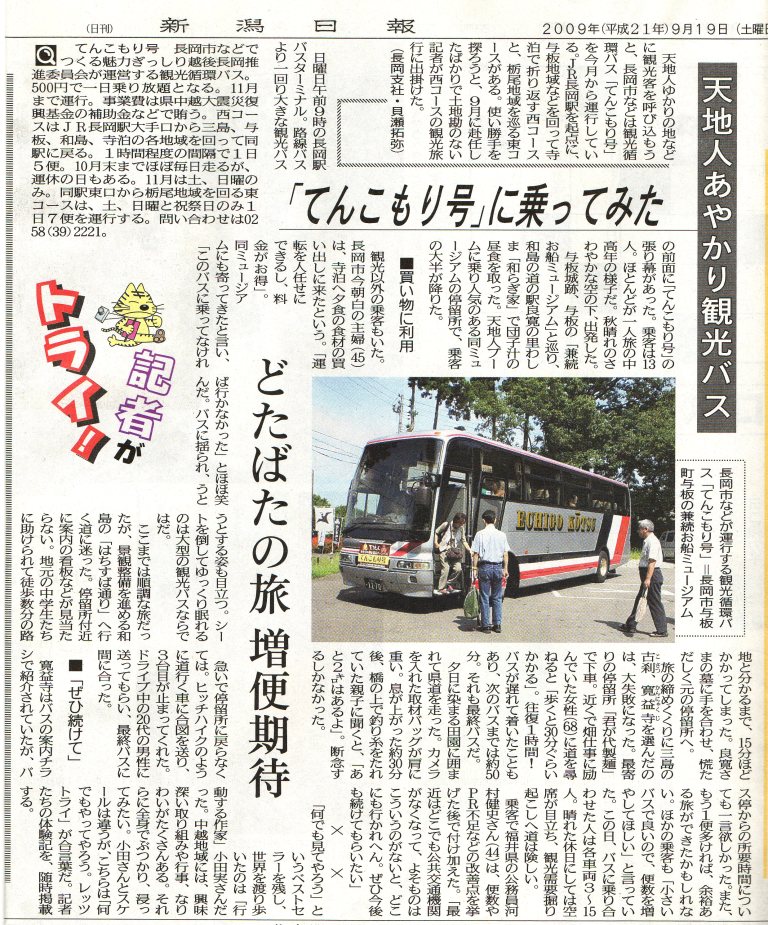 昨夜は長岡に宿泊し、今日は市内観光を少ししてから帰るということで、少し前に新潟日報に出ていた「天地人あやかり観光バス“てんこもり号”」を思い出した。が、よくよく調べてみると残念なことに今日は運休日。栃尾や寺泊にも興味を示されていたし、500円フリー切符大型観光バスでそれらを回れるしで、もってこいだったのだが。