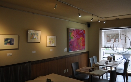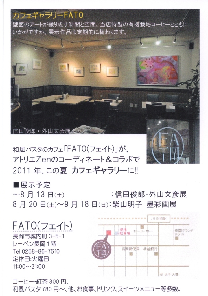 長岡駅からほど近いところ(イトーヨーカドーの立体駐車場から新潟寄りに一本いったところ)に「FATO(フェイト)」というカフェがあるのですが、8メートルもの壁面とスポットライトの設備があり、空間としても面白いことから、展示スペースに活用しカフェギャラリーとして展開することになりました。ギャラリーのコーディネート・運営はアトリエZenで担います。