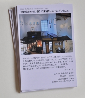 右は、先月開催の拙企画「和のなかの三人展」で、来場者(記帳者)へ郵送する「御礼状」。