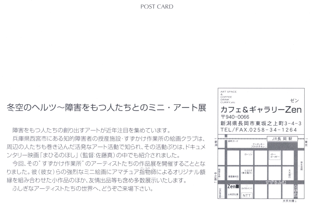 はたさんとは、1999年に私が長岡で企画した「冬空のヘルツ」という展覧会に協力してもらい、そこで知り合っている。同展では、はたさんが主宰していた「すずかけ作業所絵画クラブ」の作品を借りて展示したのだが、ただ借りるだけでは面白くないので、そのとき運営していたカフェギャラリーの常連客や作家などを巻き込んでのコラボレーションを図って構成した。例えば、額は作家の(故)五十嵐祥一氏に協力してもらい、手造りでこしらえたなど。友情出展も多く集まった。
