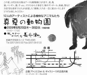 ▼真夏の動物園~12人のアーティストによる愉快なアニマルたち~(8月20~30日、柏崎市学校町3のギャラリー十三代目長兵衛にて)