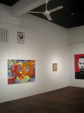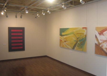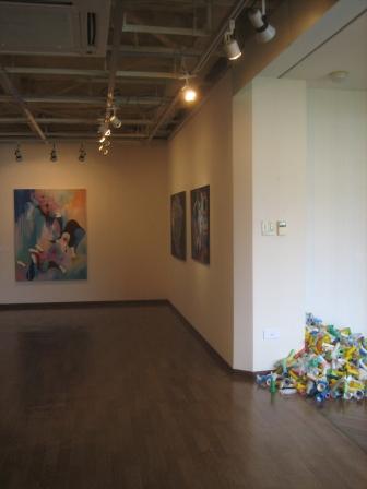 写真:井波百合子「寝室」(手前)と、信田俊郎「光の場所」(壁面の2作品)今日からスタートした「June BRIGHT!!~12人の表現」の会場風景です。