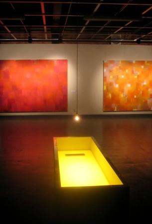 井波百合子は照明を暗く設定した旧工場棟で、直方体の箱に満たした蜂蜜を柔らかな光で厳かに浮かび上がらせる。対してその壁面には信田俊郎の大画面の油彩。暖色の色面構成がスポットライトで際立ち、カラフルなミクストメディアの伊藤希代子とともに場を作る。
