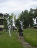 中庭を展示場所に選んだ彫刻家の霜鳥健二は、観音像と呼応するように白い角材を連ねる。柔軟な造形は自然の風にもかすかに揺れながら、風景とコラボレートしての味わいを醸し出す。草むらには佐藤郷子が小さなオブジェを点在させ、庭の奥へと視線を誘う。