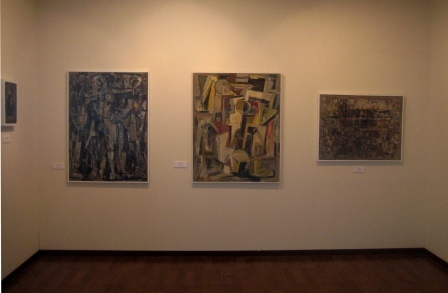 今回展示した作品群はそれまでの15年間のもので、私の抽象絵画の変容を観ていただければ幸いですが、それは現代美術という風が吹き荒れているなか、上野の公募団体に出展していた頃でもありました。このあと、私は上野の山から離れ、版という新たな世界で平面空間そのものの抽象へと向かい、油彩表現からは決別して今に至るのですが、そのひとつの時代の作品群といえましょう。