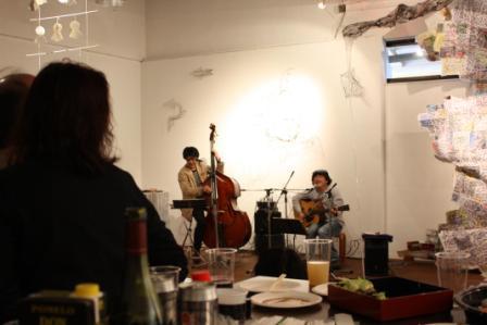 今回はいつもと違いウッドペースとのデュオでギターを前面に出しているし、会場の雰囲気も近いしで、創庫美術館のころを思い出すなぁなどとエベさんと開演前に話していたら、その「若手作家展」に出展していた工芸作家Sさんもちょうど来られました。会うのは実に久々ということで、エベさん囲んでそこだけプチ同窓会的状態に。ライブ時のMCでも話題にあがっておりました。