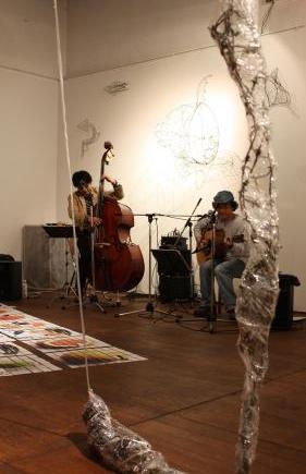 エベさんの要望もあって、演奏はごんだいらあやこさんの「魚」のワイヤーオブジェの下で。ライブの写真もごんだいらさん提供です。