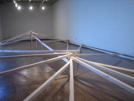 作家も言われるように「力のはいった」展覧会、行く度に見え方も変化するようです。本日の会場風景として、室内インスタレーション(角材の「影」が綺麗です)と小品の「鏡作品」(作品がうつりこむ)を。