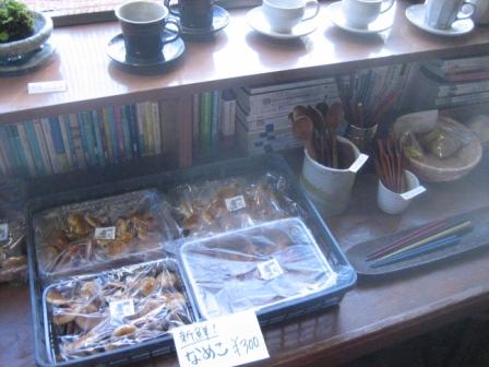 また、いつもあるわけではないのだろうが、この日は「なめこ」もなぜか販売棚に登場。地元農家から直送で届けられた新鮮かつ巨大なもので、特価で売られていた。 (下の画像、左)