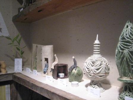 作品配置や基本レイアウトといった展示構想をいつもは事前に考えておくものだが、今回はあえて何も考えないようにして臨んだ。会場は女性陶芸家(広川さん)がひとりで運営している小さなお店で、その雰囲気を生かすためにも広川さんとの呼吸というか、作業中の何気ない会話のやりとりなどからも「場」を創ろうと考えたことが理由。店に常設されている