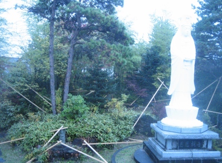 先月までこの中庭を使って展開・展示されていた前山忠氏のインスタレーション作品が一部撤去されずに庭の奥側部分、観音様の背後で再構成されており、その作品も大きな窓からあわせて観ることができる。