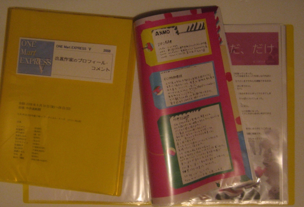 右は、毎回恒例となっている出展作家の「プロフィール&コメント」集。出展者自身の自己紹介ということで、A4サイズ1枚にプロフィールなりコメントなりをそれぞれ自由に書いてもらい、ファイリングして会場に置いている。