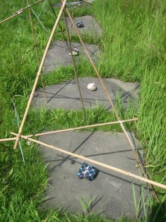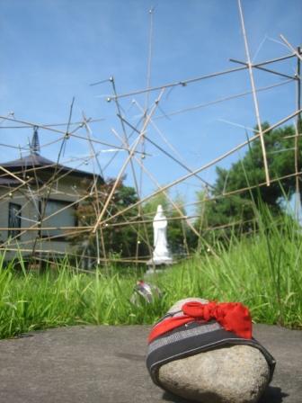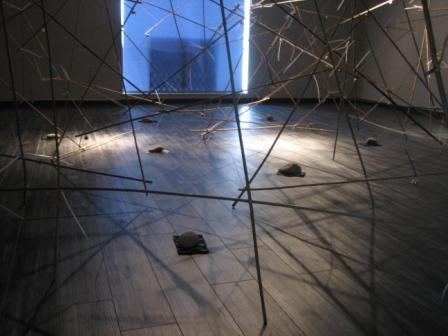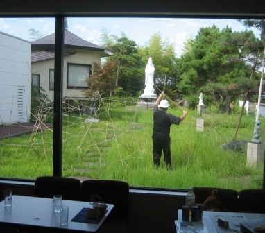 今回展では屋外(中庭)と室内(ギャラリー)でのインスタレーションの2本立てとなるが、この日はまずは屋外設置の「菊の支柱竹と熊鈴、結束バンドによる」作品から。昨年の弥彦野外アート展とギャラリーイーズでの個展で連続展開させた素材である。