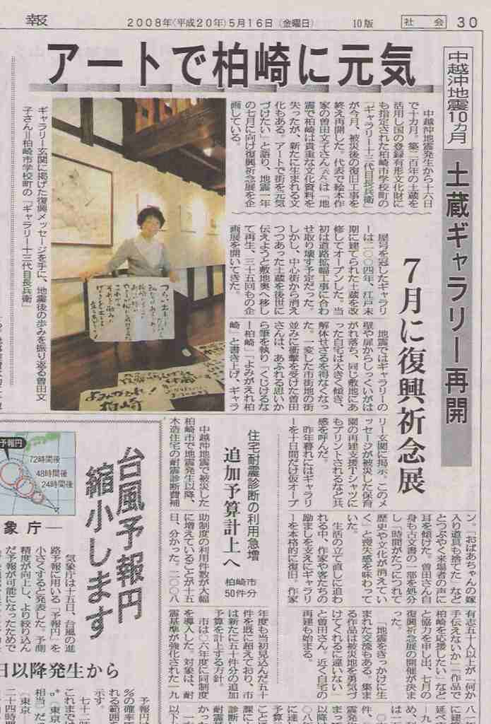 『(ギャラリーでは)「地震で柏崎は貴重な文化資料を失ったが、新たに生まれる文化もある。アートで街を元気づけたい」と、地震1年の7月に向けて復興祈念展を企画している。』と紹介されており、「地震をきっかけに生まれた交流もある。集まる作品は被災地を勇気づけてくれるにちがいない」というギャラリー・Sさんの言葉で結んでいる。
