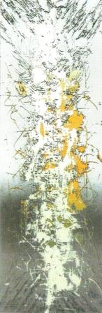 垂直または水平、あるいは斜行するその境界に視線がむかい、行きかう静かな響きともとれる世界を感応する。それらはこの抽象の形態から感じとるイメージとなり、観るものとの間に言葉を創り出すに違いない。
