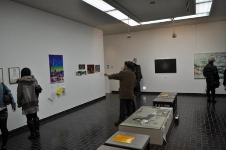 午前中は知人作家やら出展者の友人やらが入れ替わりで訪れ、さらに、美術館企画展示室の「子どものためのてんらんかい」には幼稚園児が何団体か来て、ギャラリーの前を楽しそうに通るなど、割と動きがあって面白かった。