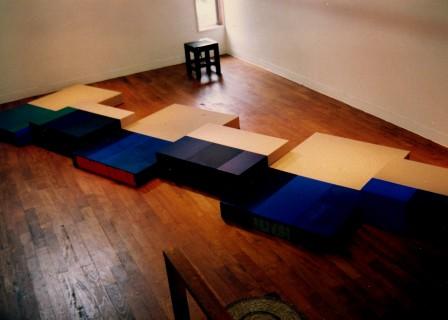 せっかくなので、その「ギャルリ伝」のときの個展風景を右に。 1994年のもの、なのでもう15年前になるのかと、時の流れをちょっと考えたりもする。このインスタレーションによる個展を2階(Gallery FLOOR2)で、1階のカフェギャラリーでは墨画家との二人展(平面)と、このときは勢いにまかせて同時に2つの展示をおこなった。