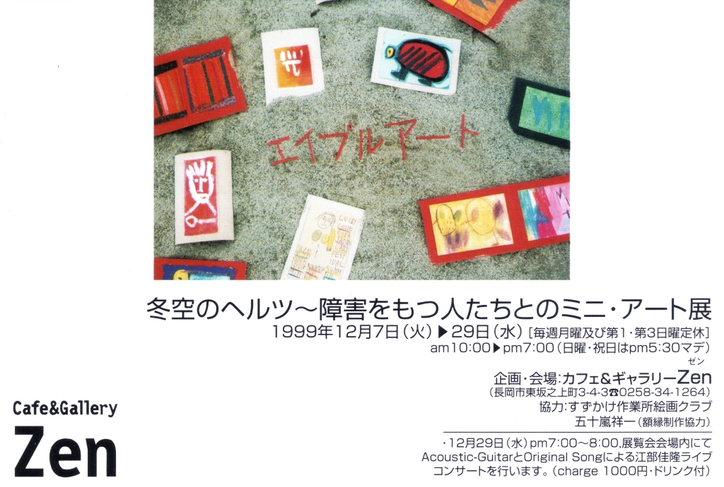 はたさんとは、1999年に私が長岡で企画した「冬空のヘルツ」という展覧会に協力してもらい、そこで知り合っている。同展では、はたさんが主宰していた「すずかけ作業所絵画クラブ」の作品を借りて展示したのだが、ただ借りるだけでは面白くないので、そのとき運営していたカフェギャラリーの常連客や作家などを巻き込んでのコラボレーションを図って構成した。例えば、額は作家の(故)五十嵐祥一氏に協力してもらい、手造りでこしらえたなど。友情出展も多く集まった。