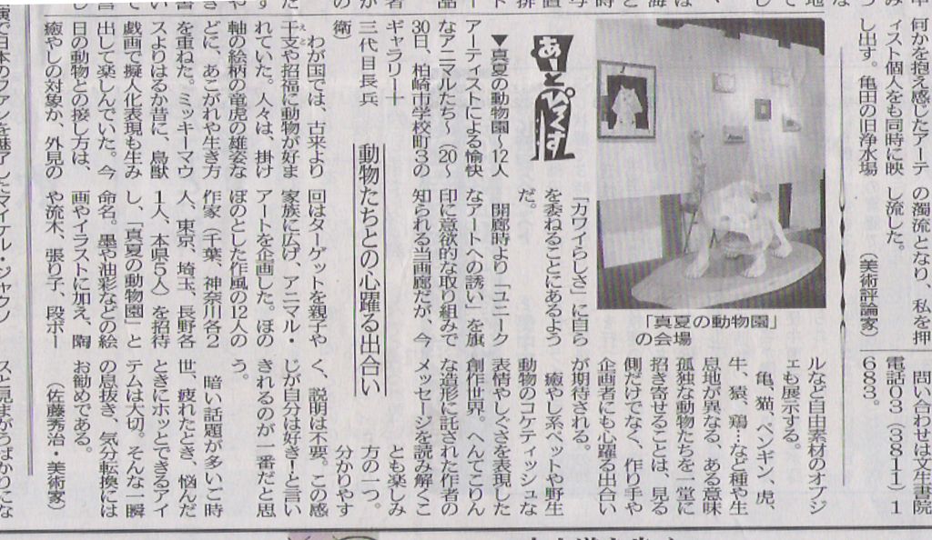 今朝の新潟日報(8月19日付朝刊)に、明日から始まる「真夏の動物園展」のレビューが掲載されています。筆者の了解をえて以下転載します。