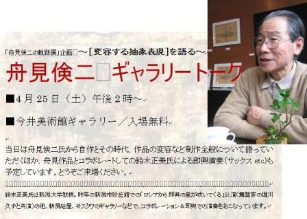 当日は舟見倹二氏のトークとともに、舟見作品とコラボレートしての鈴木正美氏による即興演奏(サックスetc)も予定しています。