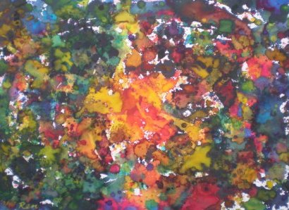 吉野榮子さんは美術教師、障がい者アートの指導者として実績を持ち、ずっと具象画を描いてきたが、子供達の感性を引き出す指導が自身をも触発し抽象へ向かったという。そして染料との出合いが吉野さんをさらに解放した。
