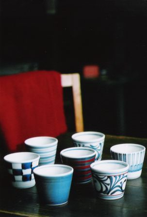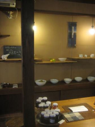 愛媛・砥部焼の窯元「梅山窯」のうつわをカフェ内で展示販売。コーヒーカップ、そばちょこ、小鉢をはじめ、角皿や大皿など。