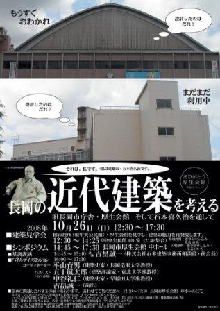 画像はシンポジウムに先立っておこなわれた建築見学会より旧市庁舎(現在の柳原中央公民館)と、長岡厚生会館。