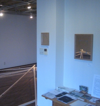 作家も言われるように「力のはいった」展覧会、行く度に見え方も変化するようです。本日の会場風景として、室内インスタレーション(角材の「影」が綺麗です)と小品の「鏡作品」(作品がうつりこむ)を。